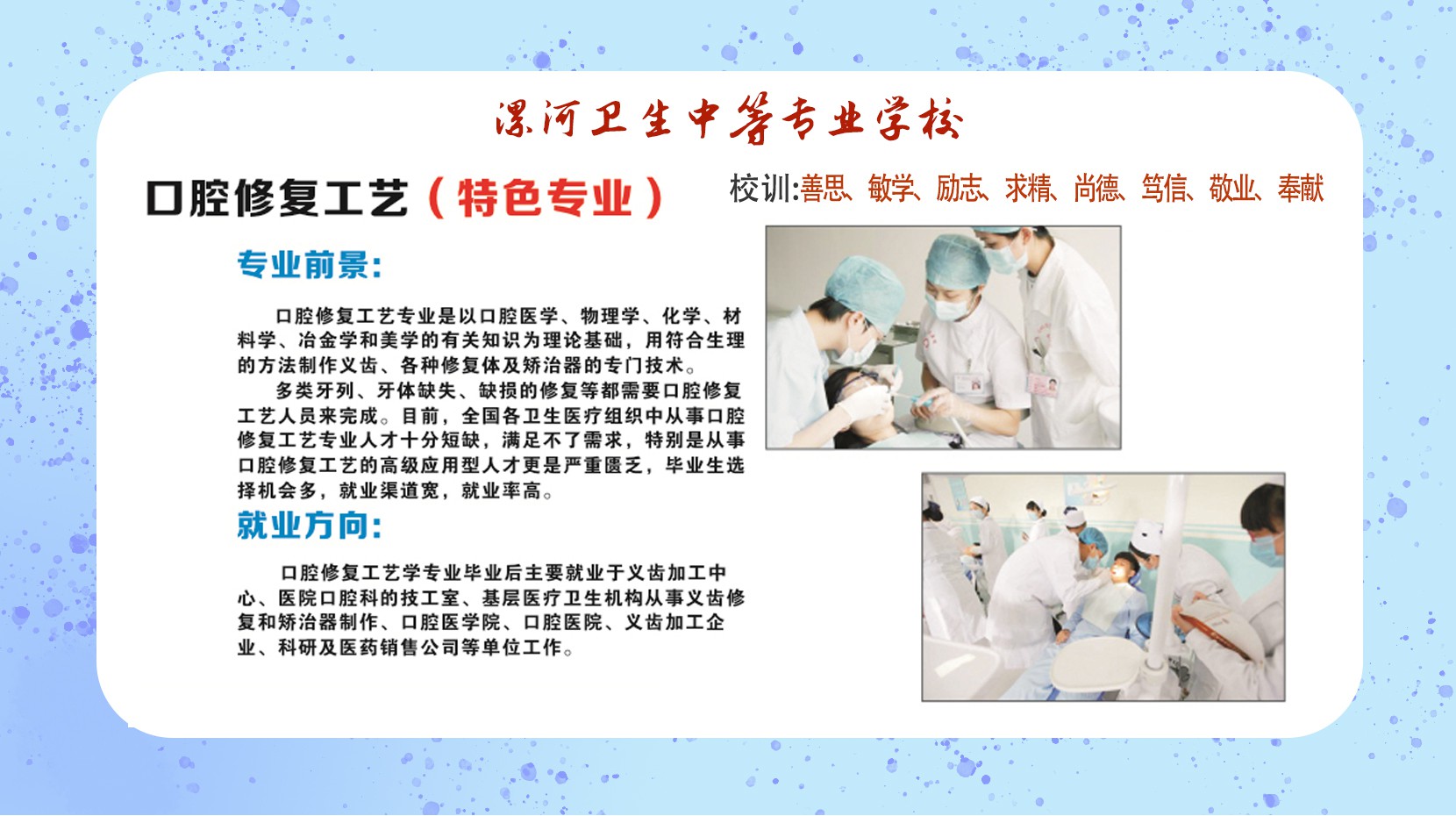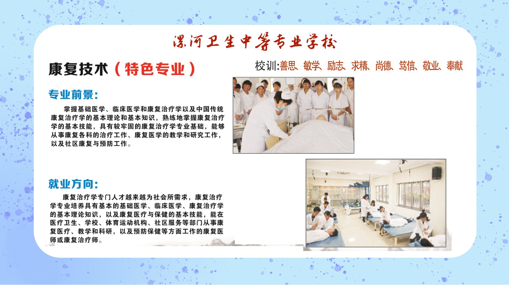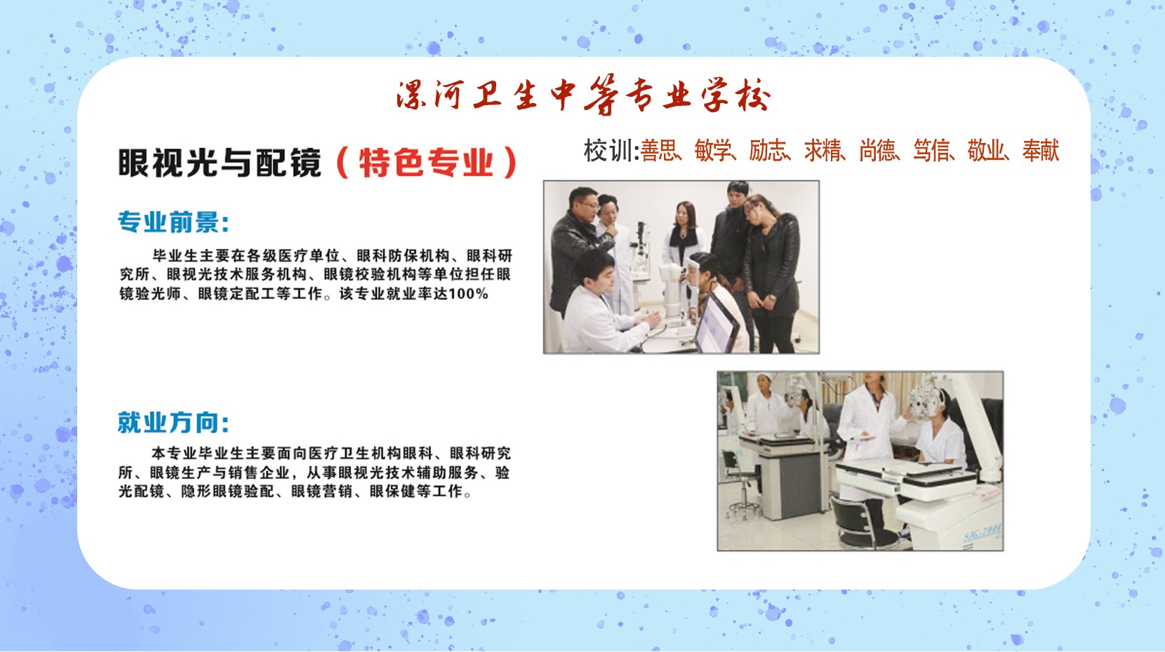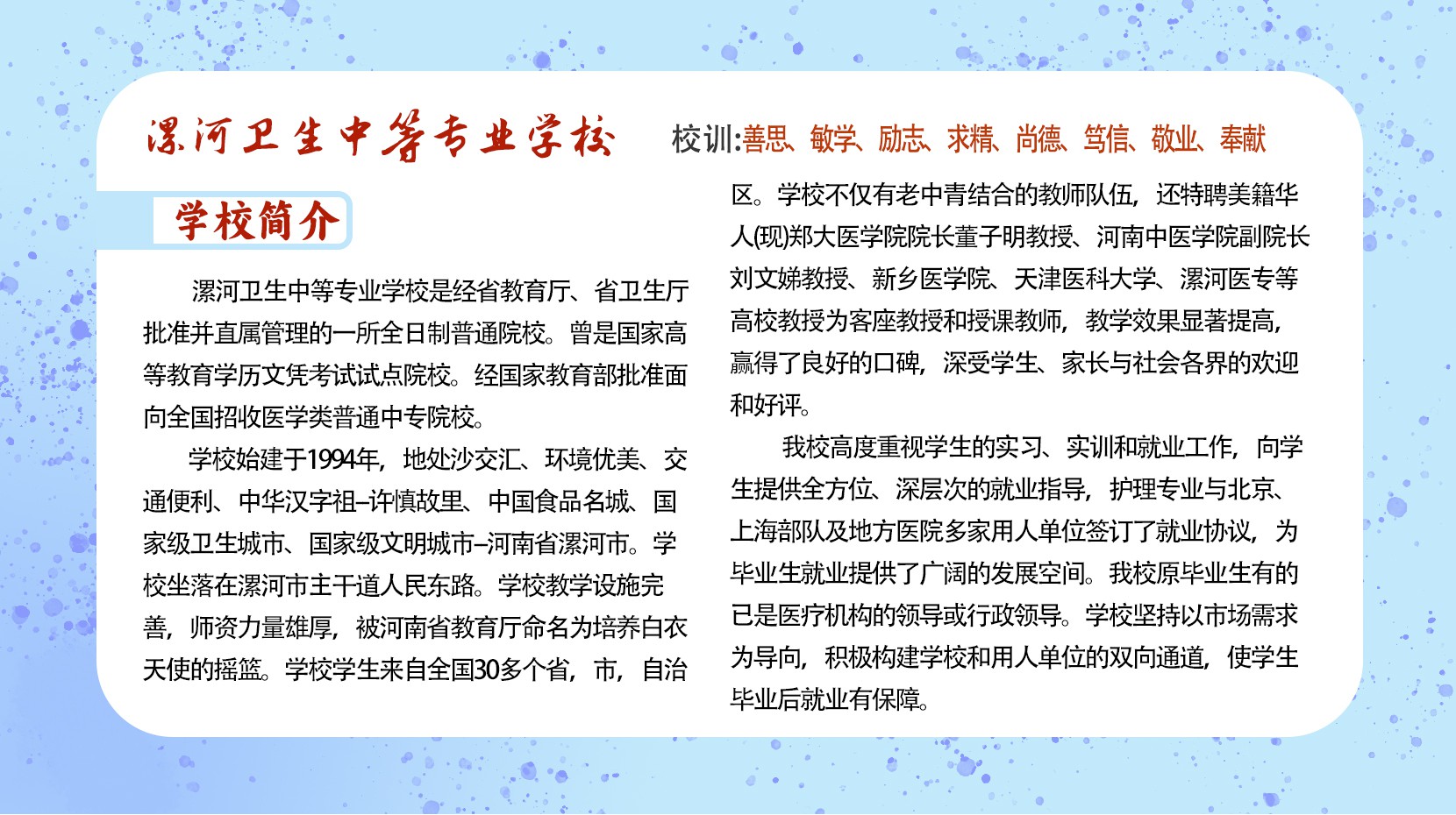 漯河卫生中等专业学校是经河南省教育厅、省卫健委批准的一所全日制普通院校。曾经国家教育部批准面向全国招收医学类的普通中等专业学校。漯河卫校始建于1994年,地处沙灃交汇、环境优美、中华汉字鼻祖——许慎故里、中国食品名城、国家级卫生城市——河南省漯河市。三条高速公路,两条铁路,两条河流穿市而过,交通十分便利。学校坐落在漯河市主干道人民东路。